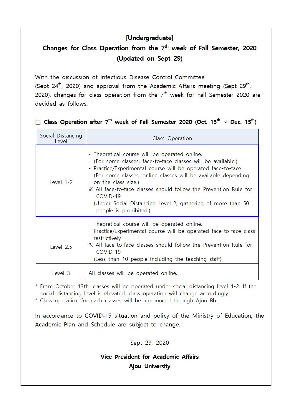 [Academic Affairs] [Undergraduate] Changes for Class Operation from the 7th week of Fall Semester, 2020 (Updated on Sept 29)