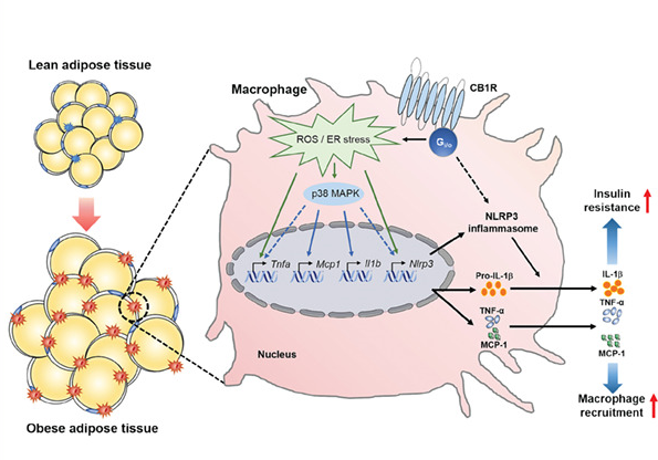 우리 학교 김욱 교수 연구팀이 새로운 비만 및 당뇨병 치료제 후보물질을 개발했다. 이 후보물질은 기존 치료제에 비해 부작용이 적고 치료 효과는 커 관련 질환 의약품 개발에 새 장을 열 것으로 기대된다.김욱 교수(응용화학생명공학과·대학원 분자과학기술학과, 사진)는 새로운 비만 및 당뇨병 치료제 후보물질 AJ5018을 발굴해 비만 및 당뇨병 치료 가능성과 함께 지방 조직에서의 항염증 효과를 밝혀냈다.연구팀의 성과는 ‘비만 생쥐 모델에서 NLRP3 염증조절복합체를 통해 지방조직 염증을 완화시키는 말초조직 칸나비노이드1 수용체 억제제(Peripheral cannabinoid1 receptor blockade mitigates adipose tissue inflammation via NLRP3 inflammasome in mouse models of obesity)’라는 제목의 논문으로 비만 및 당뇨병 분야의 저명 학술지인 최신호 표지 논문으로 선정됐다. 아주대 분자과학기술연구센터 한지혜 박사, 대학원 분자과학기술학과 신한호 학생이 제1저자로 연구에 참여했다. 연구팀이 개발한 후보물질 AJ5018은 인체 말초조직의 칸나비노이드 수용체(cannabinoid 1 receptor, CB1)만을 제어함으로써 비만 및 당뇨병 치료 효과를 가져 온다. CB1은 지질 조절제인 내인성 칸나비노이드와 결합하여 활성화 되는 수용체로, 주로 뇌에서 작용하며 활성화 될 경우 식욕과 몸무게를 증가시킨다. CB1은 뇌뿐 아니라 지방, 간, 근육, 췌장, 그리고 면역 세포와 같은 말초조직에도 분포하고 있으며 체중, 에너지 소비, 인슐린 민감성, 그리고 당 및 지질 대사 등을 조절하는 역할을 한다.김 교수팀이 개발한 후보물질 AJ5018은 유럽의약청(EMA)에서 승인을 받았다가 퇴출된 제1세대 칸나비노이드1 수용체 억제제인 리모나반트의 구조변형을 통해 개발된 물질이다. 리모나반트는 뇌에 작용함으로써 발생하는 심각한 부작용으로 인해 제약 시장에서 퇴출됐다. 김 교수팀이 개발한 후보물질은 뇌로 침투되는 것을 최소화해 부작용을 줄이고 말초조직의 칸나비노이드1 수용체만을 제어한다.연구팀은 비만 및 당뇨병 생쥐 모델에 기존 약물인 리모나반트와 AJ5018을 각각 투여해 질병의 치료 효과를 확인했다. AJ5018은 뇌에 작용하지 않기 때문에 리모나반트 투여에 의해 나타는 부작용은 확인되지 않았고, 말초조직에 작용하여 나타나는 비만 및 당뇨병의 치료 효과는 리모나반트와 유사하게 나타났다. 김욱 교수는 “말초조직에서의 칸나비노이드1 수용체 억제 방법이 만성염증질환 치료제 개발을 위한 타깃이 될 가능성이 높다”며 “이번 연구로 비만 및 당뇨병과 같은 만성염증 질환 치료제 개발에 새로운 가능성을 제시 할 수 있을 것으로 기대한다”고 말했다또한 김 교수팀은 후보물질 AJ5018을 이용하여 말초초직 칸나비노이드1 수용체 억제가 지방조직의 염증을 완화하는 것을 밝혀냈고, 이것은 NLRP3 염증조절복합체활성을 조절함으로써 일어난다는 것을 확인했다.김욱 교수는 “비만 및 당뇨병과 같이 만성염증을 동반하는 만성질환의 근본적인 치료를 위해서는 기존의 염증반응 부산물인 사이토카인 억제 방법으로는 부족하다”며 “사이토카인의 생성을 조절하는 NLRP3 염증조절복합체를 직접적으로 제어 할 수 있는 기술이 필요하다”라고 설명했다.한편 이번 연구는 과학기술정보통신부 중견연구자지원사업(전략)과 교육부 중점연구소지원사업의 지원을 받아 수행되었고 국내특허 출원이 완료됐다.