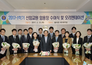 2017학년도 1학기에 임용되는 16명의 교원에 대한 임용장 수여식이 23일 오전 율곡관 제1회의실에서 열렸다. 임용장 수여식에는 김동연 총장과 최경희 산학부총장 그리고 주요 보직자들이 참석했으며 참석자들에 대한 소개와 임용장 수여, 오찬으로 이어졌다. 참석자들은 신임교원들에게 환영의 인사를 건네며 아주대 발전에 대한 동참과 애정을 당부했다. 오후에는 부서별 업무안내 등 오리엔테이션이 진행됐다. 신임교원은 본교가 13명, 병원이 3명이며 명단은 다음과 같다. 조병남(기계공학과,조교수) 한승용(기계공학과,조교수) 고제성(기계공학과,조교수) 이재현(신소재공학과,조교수) 김상완(전자공학과,조교수) 한경식(소프트웨어학과,조교수) 이승환(경영학과,조교수) 최환호(경영학과,조교수) 이한수(정치외교학과,조교수) 이병훈(다산학부대학,비정년트랙 부교수) 김진희(다산학부대학,비정년트랙 조교수) 전유영(교육대학원,비정년트랙 조교수) Jinhua Cui(경영학과,비정년트랙 조교수) 박도양(의학과,조교수) 장전엽(의학과,조교수) 지숙(의학과,조교수)