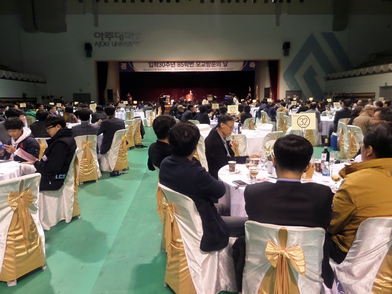 85학번 모교방문의 날 행사가 7일 오후 우리학교 체육관에서 열렸다. 7일 오후 4시부터 시작한 이날 행사에는 85학번들 180여명이 참석했고, 초청 은사와 김동연 총장, 보직 교수 등 120여명도 동참했다. 행사는 캠퍼스 투어를 시작으로 김동연 총장의 환영인사와 학교발전방향 소개, 이범재 동문회장의 축사, 행사준비 경과보고, 발전기금 전달, 축하공연 등으로 채워졌다. 동문들은 공식행사가 마친 뒤에는 학과별로 별도의 모임을 가지며 행사의 의미를 되새기기도 했다. 김동연 총장은 학교발전전략 ‘Ajou Great Turning’을 소개하며 “교직원, 동문 등과 오랜 시간 머리를 맞대고 고민한 끝에 수립한 발전전략이다. 교내에 있는 교직원, 학생 뿐만 아니라 동문들도 같이 노력해서 목표를 달성하자”고 말했다. 이범재 총동문회장도 “85학번의 단결된 힘으로 행사가 잘 마련되어 기쁘다”고 말했고, 송영섭(전산, 85) 모교방문의 날 추진위원장은 “궂은 날씨 속에서도 많이 참석해줘 고맙다. 오늘 행사를 통해 모교에 대한 애정과 의지를 다져 앞으로 30년 더 계속 이어졌으면 한다”고 화답했다. 한편, 85학번 동문들은 이날 ‘After You’ 지원기금으로 1천만원을 전달했고, 향후 발전기금 1억원도 기부학기로 약정했다.