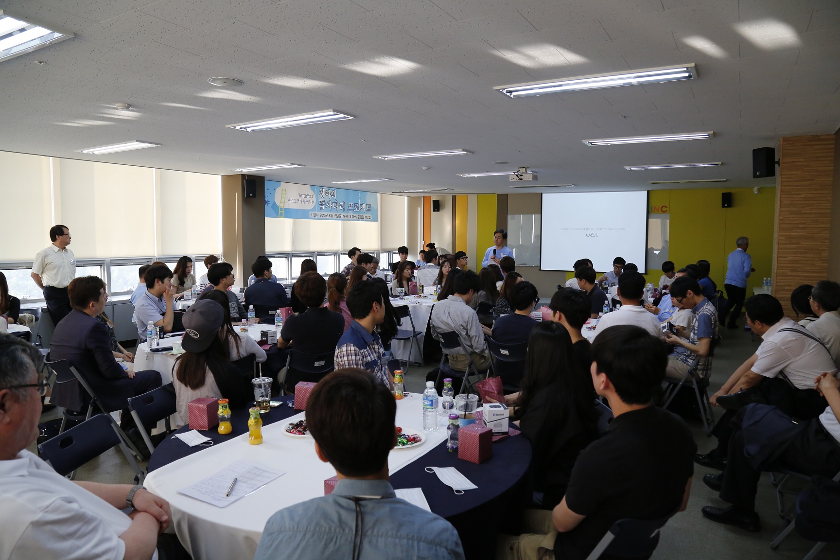 'After You 프로그램- 2015 아주 글로벌 캠퍼스' 참가자들을 위한 멘토링 행사가 12일 오후 우리 학교 종합관에서 진행됐다. 어려운 환경 탓에 야간고등학교나 야간대학을 다니며 스스로 자신의 길을 만들어간 사람들의 모임인 '청야' 회원 13명이 멘토로 함께 자리해 참가 학생들을 격려했다. 이날 행사에는 'After You 프로그램- 2015 아주 글로벌 캠퍼스'에 최종 선발된 우리 학교 학생들과 인근 지역 타 대학 학생들이 참여했다. 멘토로는 우리 학교 김동연 총장과 윤종규 KB금융지주 회장, 최순호 대한축구협회 부회장, 김홍국 하림그룹 회장, 박기태 VANK 단장 등 기업, 문화, 법조, 금융, 스포츠 분야의 저명 인사들이 나섰다. 김동연 총장의 'After You 프로그램'에 대한 소개로 시작된 이날 행사는 학생 대표의 발표와 멘토별 프리젠테이션, 질의응답으로 이어졌다. 김 총장은 "이 프로그램은 교육이 우리 사회의 계층이동을 원활하게 하는 '희망 사다리'가 됐으면 하는 바람에서 기획했다"며 "최종 참가자로 선발된 여러분이 이번 기회를 통해 세상은 넓고 도전할 분야도 많다라는 열의를 갖게 되었으면 한다"고 말했다. 학생 대표로는 임가영 학생(환경공학과), 강동호 학생(문화콘텐츠학과), 송지은 학생(경영학과)이 나서 프로그램 참여 소감과 포부를 밝혔다. 타 대학 참가자 대표로는 경희대학교 김종현 학생이 발표했다. 김동연 총장과 윤종규 KB금융지주 회장을 비롯한 멘토들은 '내 인생 최대의 의사결정'을 주제로 자신의 경험담과 함께 학생들에게 전하고 싶은 조언을 전했다. 윤종규 KB금융지주 회장은 "어려운 환경에서 성장하면서 상업고등학교에 진학하는 것이 학업을 이어가는 유일한 수단이라 생각했다"며 "고등학교를 수석졸업하고 만 18세에 은행에 부임했지만 '보이지 않는 벽'에 부딪힐 수밖에 없었다"고 말했다. 윤 회장은 이어 "그때부터 주어진 환경에서 최선을 다해 내 분야에서 1등을 해보자는 마음가짐을 갖게 됐다"며 "우리 학생들도 두려워 말고 도전하고 시도하면서 모든 일에 긍정적이고 적극적으로 임하면 좋겠다"고 덧붙였다. 본 행사 이후 학생들과 멘토들은 다산관 앞 광장에서 비어파티를 열고 대화의 시간을 이어갔다. 'After You 프로그램- 2015 아주 글로벌 캠퍼스'는 어려운 환경 탓에 해외 체류 경험을 쌓기 어려웠던 학생들을 위해 만들어진 프로그램이다. 참가자들은 미국 미시간대학과 존스홉킨스대학, 중국 상해교통대학에서 올 여름방학 4주 동안 고강도의 교육을 받게 되며 사전 및 사후 멘토링도 준비되어 있다. 미시간대학과 상해교통대학 참가자들에는 참가비용 전액이, 존스홉킨스대학 참가자들에게는 참가비용 반액이 장학금으로 지원된다. 재원은 이 프로그램의 취지에 공감하는 외부 인사들의 기부로 마련된다.