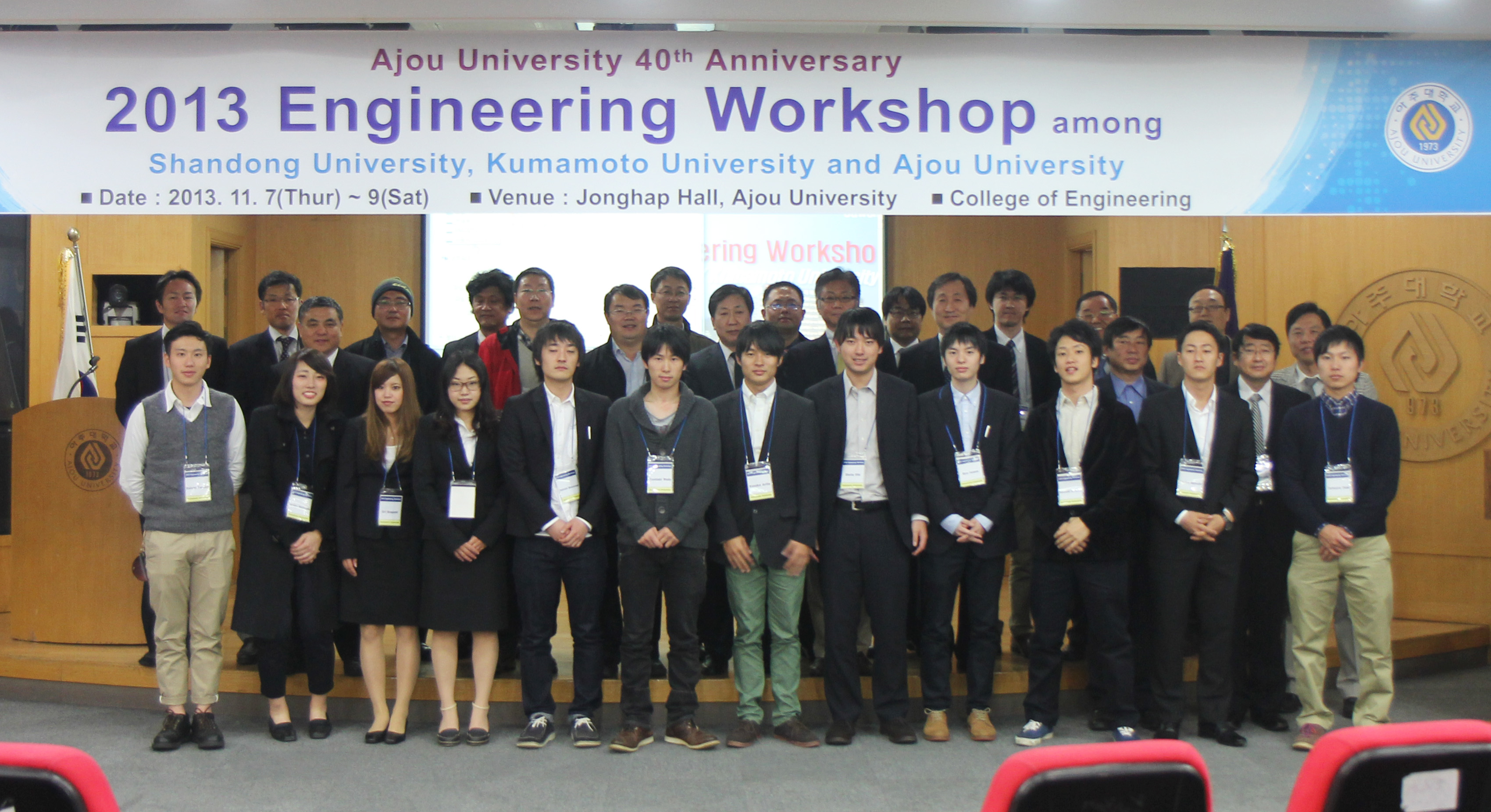 우리 학교가 ‘제6회 한중일 3개 대학 이공학포럼’을 개최했다. 이공학포럼은 우리 학교와 중국의 산동대학교, 일본의 쿠마모토대학교 3개 대학이 연구 분야 네트워크 강화를 위해 매년 진행하고 있는 행사다. 우리 학교는 지난 2010년 제3회 이공학포럼을 주최한 바 있다. 이번 한중일 이공학포럼은 7일부터 9일까지 열렸다. 컴퓨터공학, 전자공학, 화학공학 및 생화학 분야 이공학 전문가 60여명이 참가해 총 43개의 주제발표를 진행했다. 우리 학교에서는 최윤호 공과대학장, 이형천 자연과학대학장, 권용진 공과대학 부학장을 비롯해 이택균 교수, 김강석 교수, 전영목 교수, 이기정 교수, 정재원 교수, 김문석 교수, 김욱 교수, 윤현철 교수, 신귀암 교수 등이 참가했다. 한편 학교는 일본 쿠마모토대학 장학생 12명을 대상으로 한 연구실 투어 프로그램도 함께 진행하고 있다. 일본 쿠마모토대학 장학생들은 이번 포럼 기간에 맞추어 우리 학교를 방문, 오는 13일까지 10곳의 연구실에서 연구활동에 참여한다.