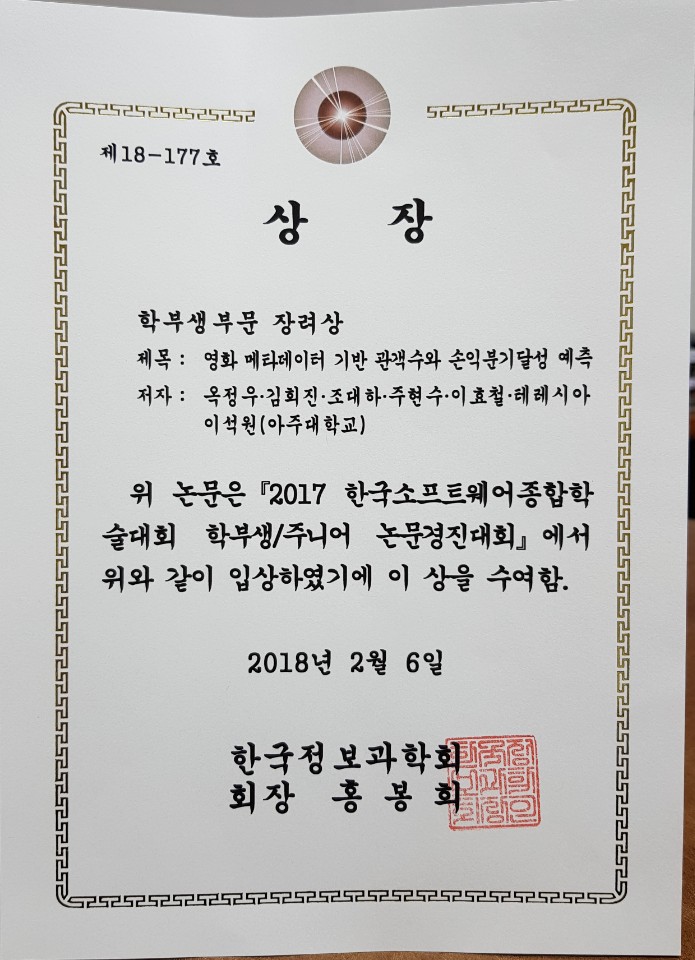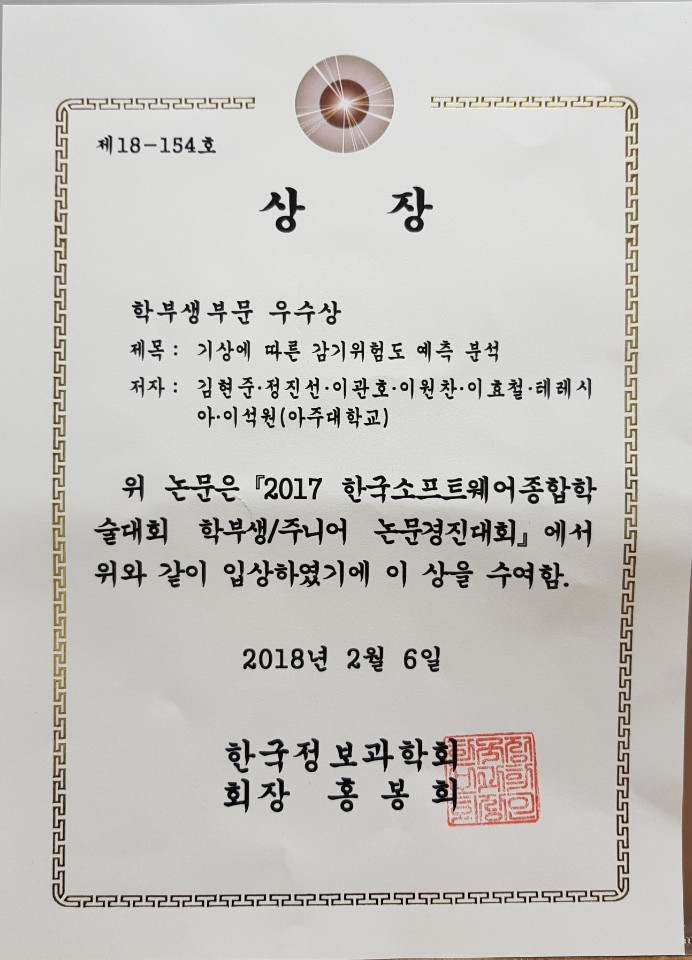 2017년 12월 20일~22일, 부산 벡스코 컨벤션센터에서 열린 2017 한국소프트웨어종합학술대회(KSC2017)에서 아주대학교 소프트웨어학과 재학생 세 팀이 학부생 논문경진대회 부문에서 다음과 같이 우수한 성적으로 수상하였습니다. 축하합니다!!* 우수상 – 김현준, 정진선, 이관호, 이원찬, 이효철, 테레시아, 이석원 “기상에 따른 감기위험도 예측분석” * 장려상 – 옥정우, 김희진, 조대하, 주현수, 이효철, 테레시아, 이석원 “영화 메타데이터 기반 관객수와 손익분기달성 예측” * 장려상 – 윤진수, 고광표, 곽규리, 김영균, 이효철, 테레시아, 이석원 “빅데이터를 통한 청소년 폭력 예방 시스템” 이는 2017학년도 2학기 소프트웨어학과 집중교육1 (지도교수 이석원), Data Science and Knowledge Engineering 수업에서 다양한 프로젝트를 수행한 결과이며, KSC 2017 학회참석 및 발표는 소프트웨어중심대학 사업단 지원을 받았습니다.