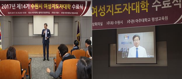 [평생교육원, 수원시] 제14기 수원시여성지도자대학 수료식 개최 10월 18일, 제14기 수원시여성지도자대학 20주간의 여정을 끝내고 수료를 맞이했다. 수원시여성지도자대학은 14년간 지속적으로 주관하고 있으며 수원시 거주하는 여성을 대상으로 21세기 리더로 활동할 수 있도록 다양하고 특화된 교육을 통해 정치, 사회 참여동기를 부여하며 여성리더로서의 리더십을 키워갈수 있도록 운영하였다. 제14기 수원시여성지도자대학은 총 17개 강좌로 진행된 본 과정은 평생학습의 필요성을 느끼게 했던 교육대학원 최운실 교수의 첫강의를 시작으로 인문대 박만규, 교육대학원 김주후, 의과대학 박샛별, 심리학과 김완석 교수 등 본교 교수진의 내실있는 강의와 소설가 강진, 경기도 선거관리위원회 주선미 교수, 출판전문가 송숙희 강사 등 외부 전문가들의 특강으로 진행되었다.이번수료식은 이성엽 평생교육원장의 기념사, 엄태영 수원시장의 영상축사로 시작되었고, 이어 수원시 여성리더회 김미선 총회장 격려사가 진행되었으며 수원시 여성정책 장동훈과장, 박세준팀장, 김진옥 주무관을 비롯하여 수원시 여성리더회 10명의 차기회장들과 임원들이 자리를 참석하여 빛내 주었다.총 59명 원우 중 85%이상인 50명이 수료하였으며 개근상은 김윤정 외 9명이 수상하였고 또한 부단히 14기 교육생들은 이끌어준 김춘녀 회장이 공로상을 수상하였다. 교육 과정 중 각각의 주제를 정하여 팀를 편성한 후 팀별 활동을 진행하였고 그 결과를 수료식에서 발표하여 시상을 진행 하였다. 대상은 자기개발조 황은숙 원우 외 9명 그리고 최우수상 지역문화조 장일연 외 9명, 우수상은 여성정책조 박덕례외 7명이 수상하였다.제14기 수원시여성지도자대학을 수료한 원우들은 함께한 배움이 즐거워지고 그 시간이 가장 행복한 시간 이였기에 감히 감사의 말을 전한다고 소감을 밝혔다. 제15기 수원시여성지도자대학은 18년 5월에 개강할 예정이며 자세한 사항은 아주대학교 평생교육원(031-219-3583)으로 문의하면 된다.