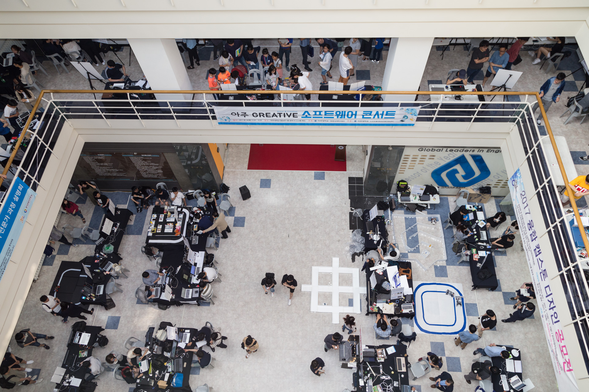 정보통신대학 소프트웨어학과에서는 6월 8일 팔달관에서 2017 '아주 Greative 소프트웨어 콘서트'를 개최하였습니다. 소프트웨어 콘서트는 소프트웨어학과에서 매학기 개최하는 교과목 프로젝트 발표회로, 이를 통해 학생들의 학습참여에 대한 동기 부여 및 SW 가치확산을 추구하는 행사입니다. 금번 행사에는 2017-1학기 소프트웨어학과 교과목 프로젝트 결과물을 비롯하여 사이버보안학과 BK21+ 사업팀이 참여하였고, SW중심대학지원사업의 가치확산 사업의 일종인 초등학교 방문형 SW 교육 참여팀까지 다양한 팀들이 참가하여 총 99팀, 242명의 학생이 전시에 참가하여 훌륭한 작품들을 많이 만나볼 수 있었습니다. 행사 종료 후 교수님들의 평가를 통해 아래와 같이 우수작을 선정하였습니다.1. 개발시연 부문(팀) - 최우수상 : Sovengers(소프트웨어학과 김동규, 배홍열, 임지훈, 임찬우) Viewcar(소프트웨어학과 서현준, 양창석, 이관형, 정유진) - 우 수 상 : Clover(소프트웨어학과 김채원, 김태호, 부은성, 임희락) Godori(소프트웨어학과 김승연, 박호철, 양한나, 유성민) Galaxy Bomb(소프트웨어학과 김지수, 박민기, 손병호, 이창규) - 장 려 상 : Butterfly Effect(소프트웨어학과 박성미, 심민정, 안성수, 이강혁)2. 연구부문(개인) - 우 수 상 : 소프트웨어학과 김지우, 김태호, 송경아, 윤채영, 기계공학과 이종관 - 장 려 상 : 소프트웨어학과 정소영3. 초등학생 부문(팀) - 우 수 상 : 매탄초등학교 박세준, 이선우 연무초등학교 김수인, 김은지, 백민아, 최수진 일월초등학교 강은택, 서광훈 효원초등학교 김모강, 오혜인, 차은지