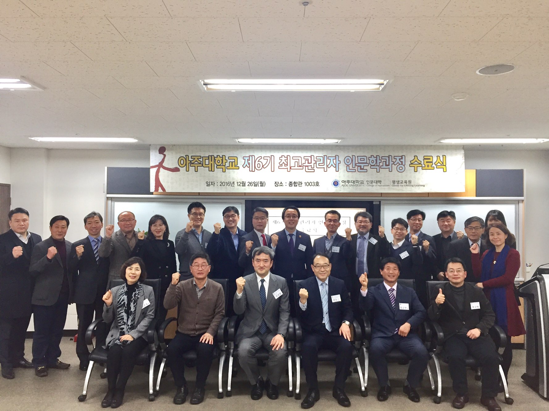 ‘인문학으로 혁신하고 실천하다’12월 26일, 제6기 최고관리자 인문학과정이 13주간의 여정을 끝내고 수료를 맞이했다.제6기 최고관리자 인문학과정은 ‘혁신과 실천’을 주제로 공사기업의 최고경영자, 정부 인사, 금융·법조·의료 등 전문직 종사자 등을 대상으로 △공통 테마가 있는 강의 △나를 찾는 고전텍스트 공부 △인문 경영능력 함양 등의 교육 과정을 진행하였다.이번 수료식에는 6기 최고과정 원우 13명을 비롯하여 1~5기 원우 5명과 박만규 인문학아카데미아원장, 이성엽 평생교육원장, 박구병 사학과 교수 등 관계자가 수료식에 참석하여 자리를 빛내주었다. 수료식은 박만규 인문학아카데미아원장의 격려사, 이성엽 평생교육원장의 축사, 수강 소감 발표 등으로 진행되었으며 6기 원우 20명이 수료하였다. 또한 부단히 6기 원우회를 이끌어준 홍순만 회장, 김기범, 김희선 부회장 및 반용달 총무가 공로상을 수상하였으며, 성실히 수업에 참석하여 타의 모범이 되어준 윤영선 최고과정 원우가 특별상을 수상하였다.신풍건설중기 대표이사이자 이번 6기 회장인 홍순만 원우는 “6기 최고관리자 인문학과정 원우들이 오늘 이 자리를 기점으로 동문회의 구심점이 될 수 있기를 기원하며, 이 좋은 과정에 끝까지 함께 할 수 있어서 영광입니다” 고 수강소감을 밝혔다.제7기 최고관리자 인문학과정은 17년 3월에 개강하며 자세한 사항은 아주대학교 인문대학(031-219-2801), 평생교육원(031-219-1565)으로 문의하면 된다.