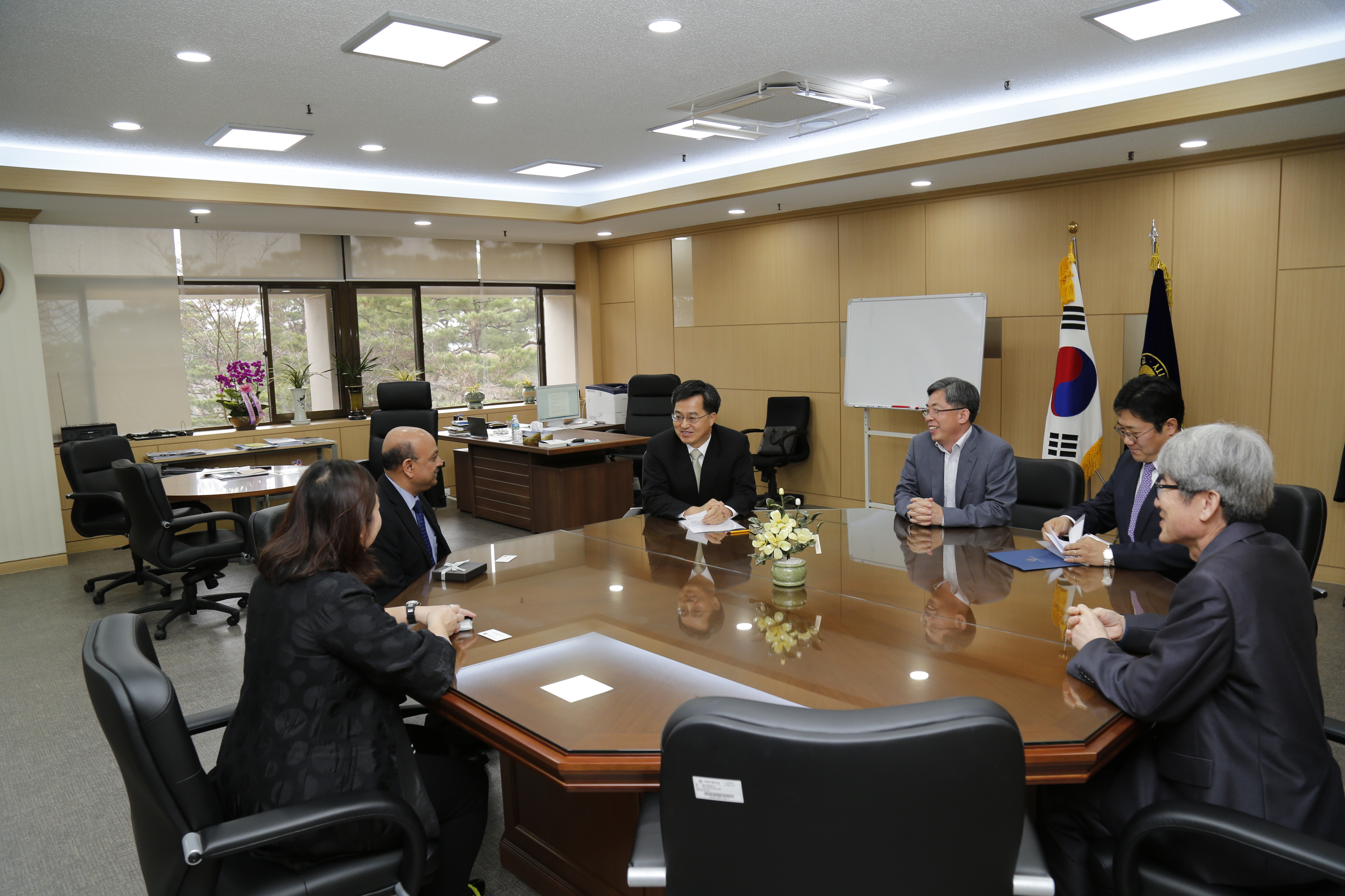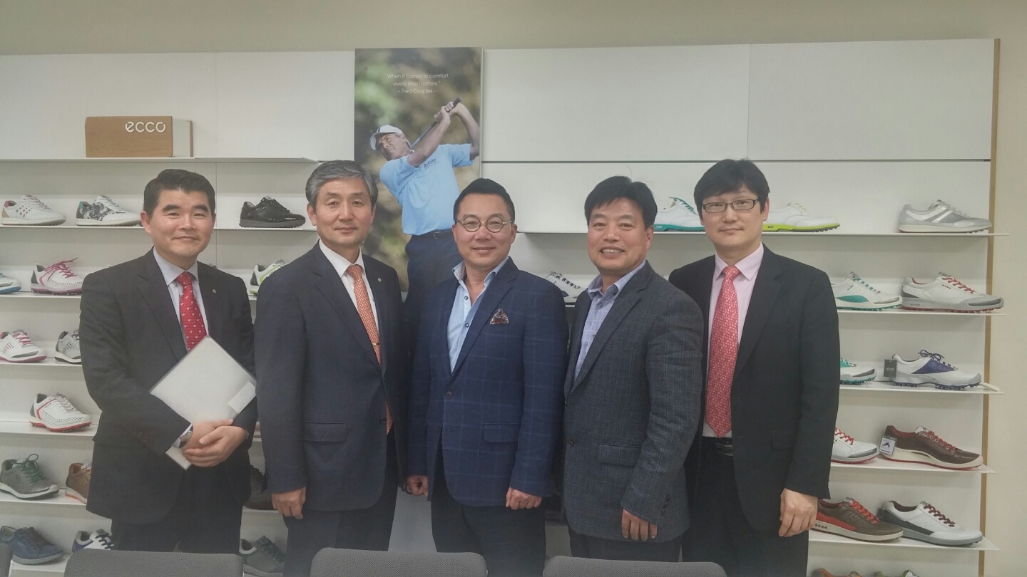 중앙 신두* 동문(불문79), 중앙우측 정창* 동문(영어79) 방문대상자 성함 : 신두* 대표이사(불문79) 소 속 : JD플러스(주) 방문자 성명 : 김윤기(대학발전본부장), 정창*(영문79‘), 이강준,황원복(대학발전본부) 방문일시 : 2015년 3월 26일 15시 00분 방문장소 : JD플러스(주) 판교본사 ( 경기도 성남시 분당구 대왕판교로 660, A동 11층(삼평동, 유스페이스1) ) 신두* 동문의 JD플러스(주)는 포르투갈, 태국, 중국 등 전 세계에 생산기지를 가지고 있는 덴마크 신발제품 전문기업 ‘에코’의 골프화 상품을 들여와 국내에 판매하는 기업이다. 500만 인구의 덴마크는 겨울이 길고 척박한 토양에 다습하여 가구, 장난감, 인테리어 제품 등 가내 수공업 제품을 세계화하기 위해 일찍이 해외로 눈을 돌린 다수의 기업을 보유하고 있으며, 그 중 하나가 실용성과 전형적인 북유럽 스타일의 전통 문양을 대표로 한 신발전문 디자인 그룹 ‘에코’이다. 불문과 졸업 후 제약회사, 전자부품회사를 거쳐 워싱턴골프코리아와 캘러웨이골프(1991), 오디세이, 클리브랜드(2005), 아담스 등 골프업계에 30년 인연을 이어오고 있으며 작년부터는 그동안 운영하던 에코코리아에서 골프화 부분만을 분리하여 운영하고 있다. 에코코리아는 국내 300여개 지점망을 갖추고 5만개 정도의 판매실적을 올리며 에코그룹 내 세계 3위의 판매 실적을 보이는 등 실질적인 성장세를 보이고 있다. 직원은 전체 20명 내외로 경기도 이천에 500평 규모의 자체 물류창고를 보유하고 15명정도가 근무하고 있으며 전년도부터 100억 정도의 매출을 보이고 있다. 국내 골프화 비즈니스와 트랜드를 선도하기 위해 수시로 해외 전시장을 직접 방문하여 점검하는 등 노력과 페이스북 등 SNS에도 많은 시간을 투자하고 있다.
