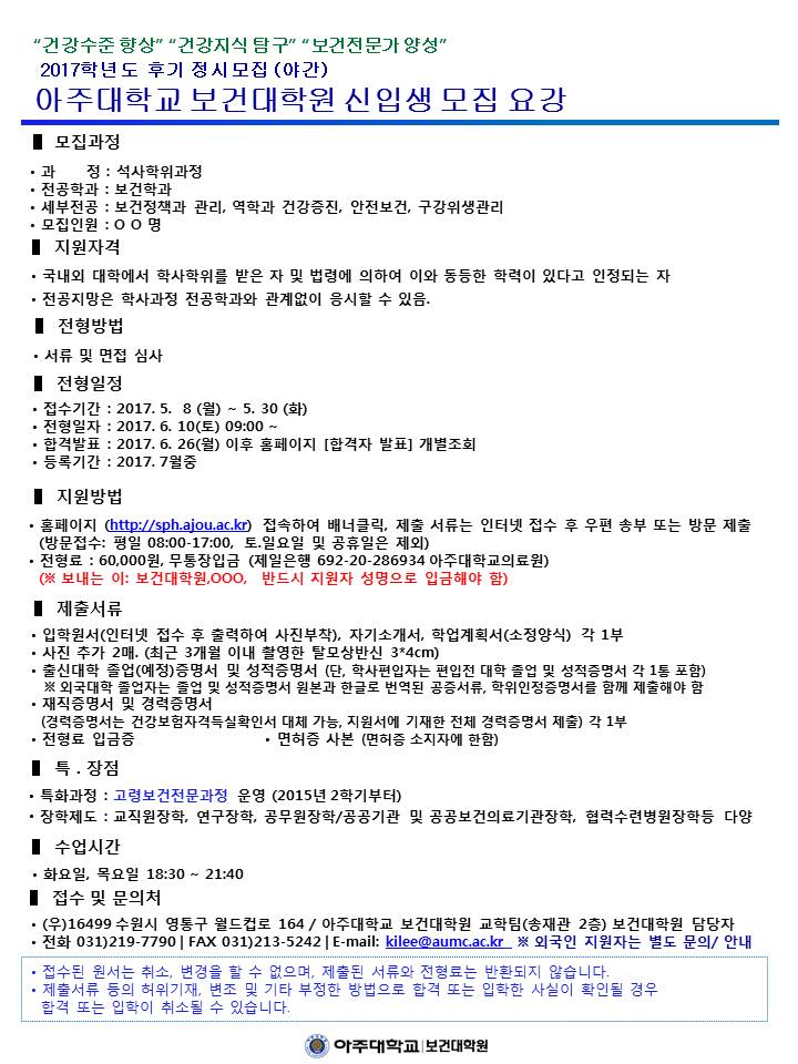 | 3623 | 입학 | 보건대학원교학팀 | 2017-05-02 | ||