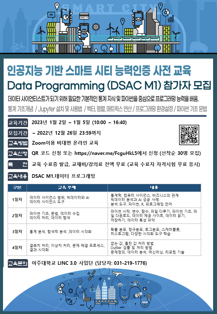 [LINC 3.0] (전액무료) 인공지능 기반 스마트 시티 능력인증 사전교육 Data Programming (DSAC M1 자격 과정) 참가자 모집(~12/26)
