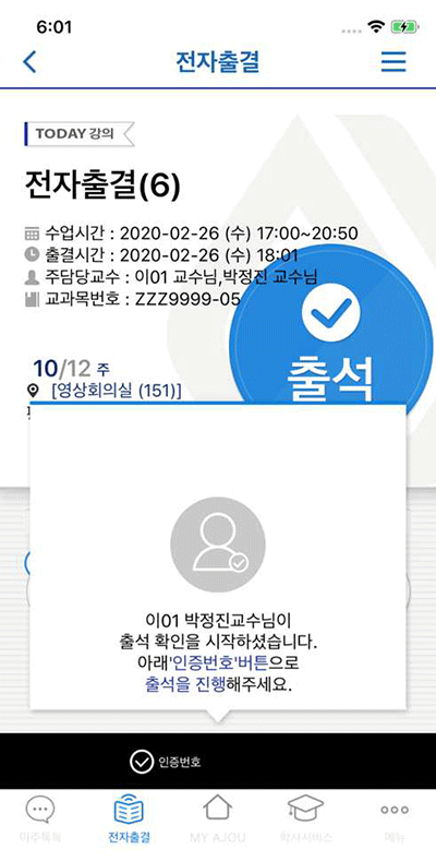교수님이 지정한 인증번호를 입력한 경우, 출석으로 처리됩니다.