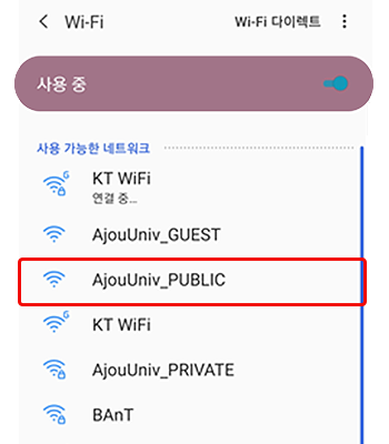 3. Wi-Fi SSID 목록 중 “AjouUniv_PUBLIC” 클릭