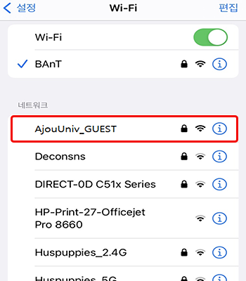 4. Wi-Fi SSID 목록 중 “AjouUniv_GUEST” 클릭