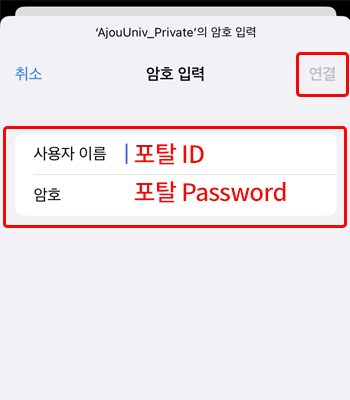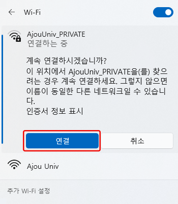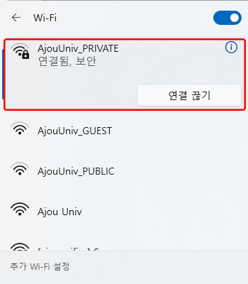 6. “AjouUniv_PRIVATE”에 연결됨을 확인한 후