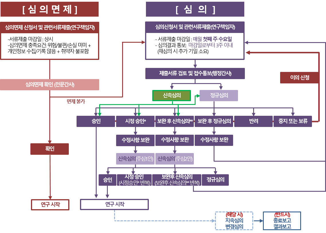 - 시정승인 - 수정사항 제출 - 연구시작 - 지속심의(1년이상), 변경심의(변경 시) - 종료보고, 결과보고