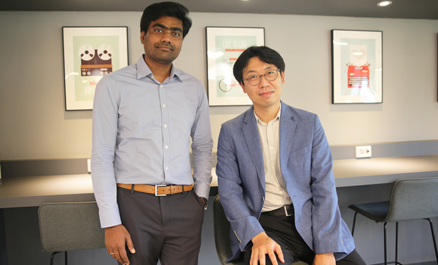 아주대와 팬옵틱스 공동 연구팀이 실크 단백질 나노섬유를 활용해 다기능 전자문신을 구현하는 데 성공했다. 이에 원하는 회로를 그려 넣은 후 굴곡진 피부 조직에 부착, 진단 및 약물 전달용으로 활용할 수 있는 차세대 헬스케어 소자로 이용될 전망이다.우리 학교 김성환 교수(물리학과·대학원 에너지시스템학과, 사진 왼쪽)는 실크 단백질 나노섬유 위에 탄소나노섬유 잉크로 회로를 그려 넣는 방식의 전자문신 구현에 성공했다고 밝혔다. 이번 연구 성과는 신소재 분야 최고 권위지 중 하나인 <어드밴스드 머트리얼즈(Advanced Materials)> 권두 표지논문(Frontispiece)으로 5월6일 자에 온라인 게재됐다. 논문 제목은 ‘피부 위 진단 및 치료응용을 위한 다기능, 극박 전자문신(Multifunctional and Ultrathin Electronic Tattoo for On-Skin Diagnostic and Therapeutic Applications)’이다. 이번 연구는 광학 전문 기업 팬옵틱스와의 산학협력 연구를 통해 진행됐다. 제1저자로 우리 학교 나렌다 고굴라 BK연구 조교수(사진 오른쪽), 공동저자로 팬옵틱스의 김장선 대표이사 외 3인이 참여하였다. 최근 전 세계적으로 인체 조직에 부착 가능한 차세대 헬스케어용 전자 소자에 대한 연구가 매우 활발하다. 생체 신호를 직접 읽어 들이고 분석할 수 있는 덕분. 이러한 헬스케어용 전자 소자를 구현하기 위해서는 실제 생체 조직과 같이 유연하고 잘 늘어나는 전자 소자가 필요하다. 이에 많은 연구자들이 유연 기판에 전극과 전자 소자를 집적, 다양한 인체 신호를 읽고 분석하는 소자를 개발해왔다. 이러한 형태의 소자는 ‘피부를 인공적으로 모방한 전자 소자’라는 개념으로 해석되어 ‘전자 피부’라 불린다.이렇게 개발된 전자 피부와 실제 인체 피부와의 완벽한 인터페이스를 위해서는 지문을 비롯한 굴곡진 표면을 따라 부착할 수 있어야 하며, 생체 적합성도 중요하게 고려해야 한다. 따라서 전자 회로를 생체적합 물질을 사용해 매우 얇게 구현해야 하는 어려움이 존재해왔다. 이에 김성환 교수 공동 연구팀은 천연 실크 단백질에 주목했다. 누에고치에서 나온 실크 단백질은 생체친화적이고 물리적·화학적 물성이 우수해 활용 가능성이 높은 바이오 고분자 소재다.먼저 연구진은 전기방사 방법을 활용하여 인간 머리카락 50분의 1 두께의 실크 나노섬유 종이를 제작했다. 여기에 탄소 나노섬유 잉크를 활용, 붓으로 실크 나노섬유 종이에 원하는 모양의 회로를 그려 넣었다. 잉크가 마르면서 그린 모양대로 회로가 떨어져 나오고, 이를 문신 스티커처럼 물을 살짝 묻힌 피부에 올려놓기만 하면 전자문신을 형성하는 것이 가능하다. 이렇게 만든 전자문신은 두께가 매우 얇아서 지문처럼 촘촘하게 주름진 표면에도 올릴 수 있으며, 샤워를 제외한 여타 일상 생활 속에서도 안정적으로 전기적 특성을 유지할 수 있다. 전자문신의 사용을 마치면 물티슈 등으로 가볍게 닦아내면 되기에 관리도 쉽다. 탄소 나노섬유에서 기인할 수 있는 유해성은 전자문신 중간에 삽입된 실크 나노섬유가 차단해 준다. 피부에 부착한 전자문신은 심전도와 근전도 검사를 위한 전극으로, 혹은 온열 치료나 약물 전달을 위한 패치로 응용이 가능하다. 전자문신에 약한 전류를 흘려주거나 빛을 쬐어주면 탄소 나노섬유에 의해 열을 발생시킬 수 있다. 특히 빛을 활용할 수 있다는 점은 원격으로 전자문신을 데울 수 있음을 의미하고, 이는 응용 범위가 매우 넓다는 것으로 해석할 수 있다. 실크 단백질에 원하는 약물을 탑재할 수도 있어, 원격으로 문신 온도를 조절하여 약물 전달 효율을 조율할 수 있다. 김성환 교수는 “인체 피부에 전자회로를 집적하려는 연구는 많은 진전을 이루어 왔지만 생체 적합성 및 생체 조직과의 인터페이스 문제는 상대적으로 간과되어 온 측면이 있다”며 “생체 물질인 단백질을 활용해 생체 조직과 전자 소자의 상이한 물성 차이를 극복할 인터페이스를 제공할 수 있다”고 말했다.김 교수는 이어 “이번에 개발한 소재 기술은 바이오 소재들이 전자 소자 구현에도 적용될 수 있음을 보여줬다는 데 의의가 있다”며 “앞으로 다양한 헬스케어 소자와 소프트 로보틱스 분야에 적용할 수 있을 것”이라고 덧붙였다. 이번 연구는 한국연구재단 주관 중견연구자지원사업, BK21 Four 사업과 경기도 주관 지역협력연구센터사업(GRRC), 한국에너지기술평가원 주관 에너지인력양성 사업의 지원으로 수행되었다. 관련 기술은 팬옵틱스와의 산학협력 연구를 통해 개발되었으며, 국내 특허 출원과 함께 일부 기술이전 되었다. <연구 개념을 보여주는 모식도. 누에고치로부터 만들어진 실크 종이에 전도성 잉크로 전자회로를 그린 후 문신처럼 피부에 부착할 수 있다>