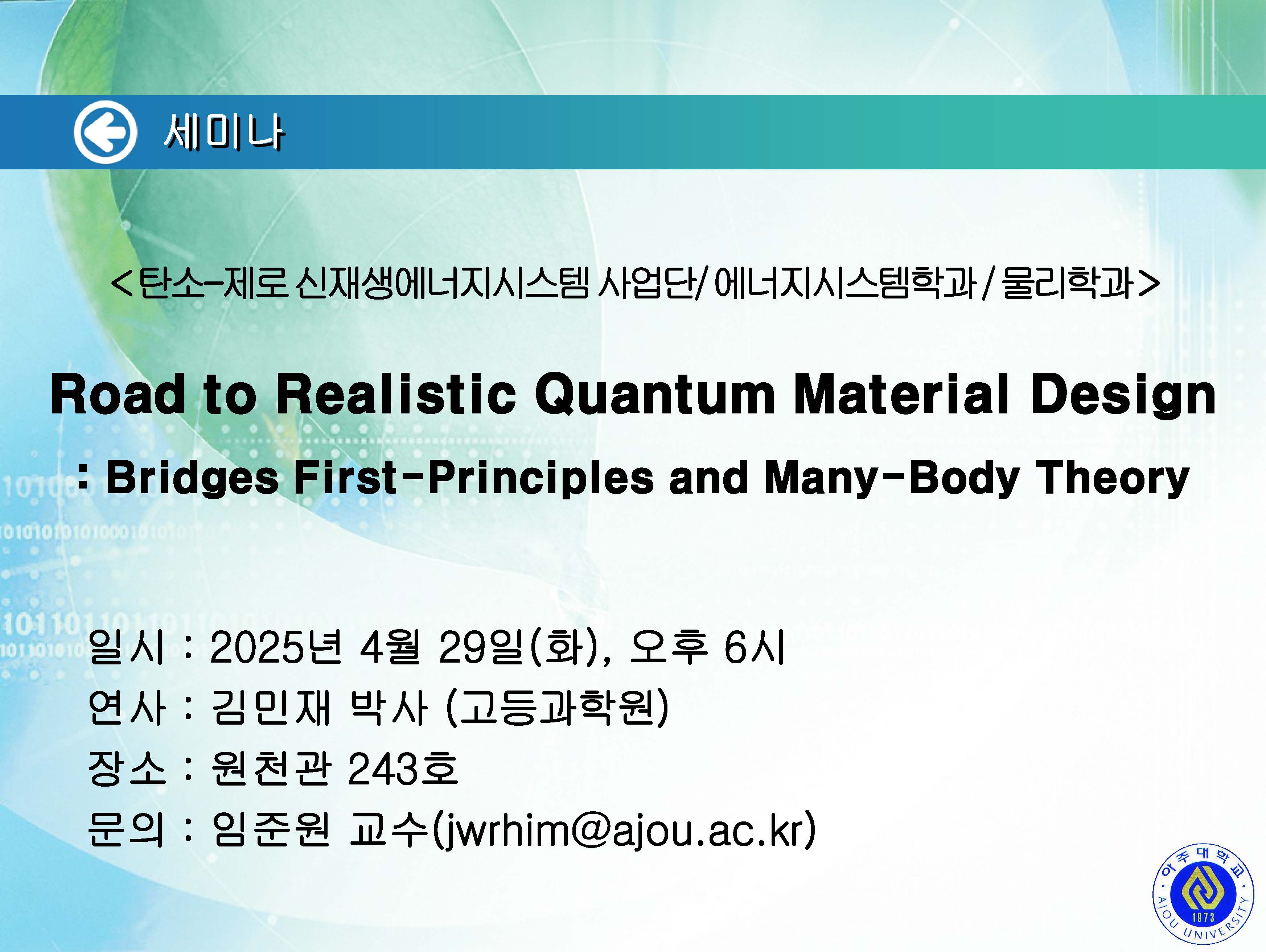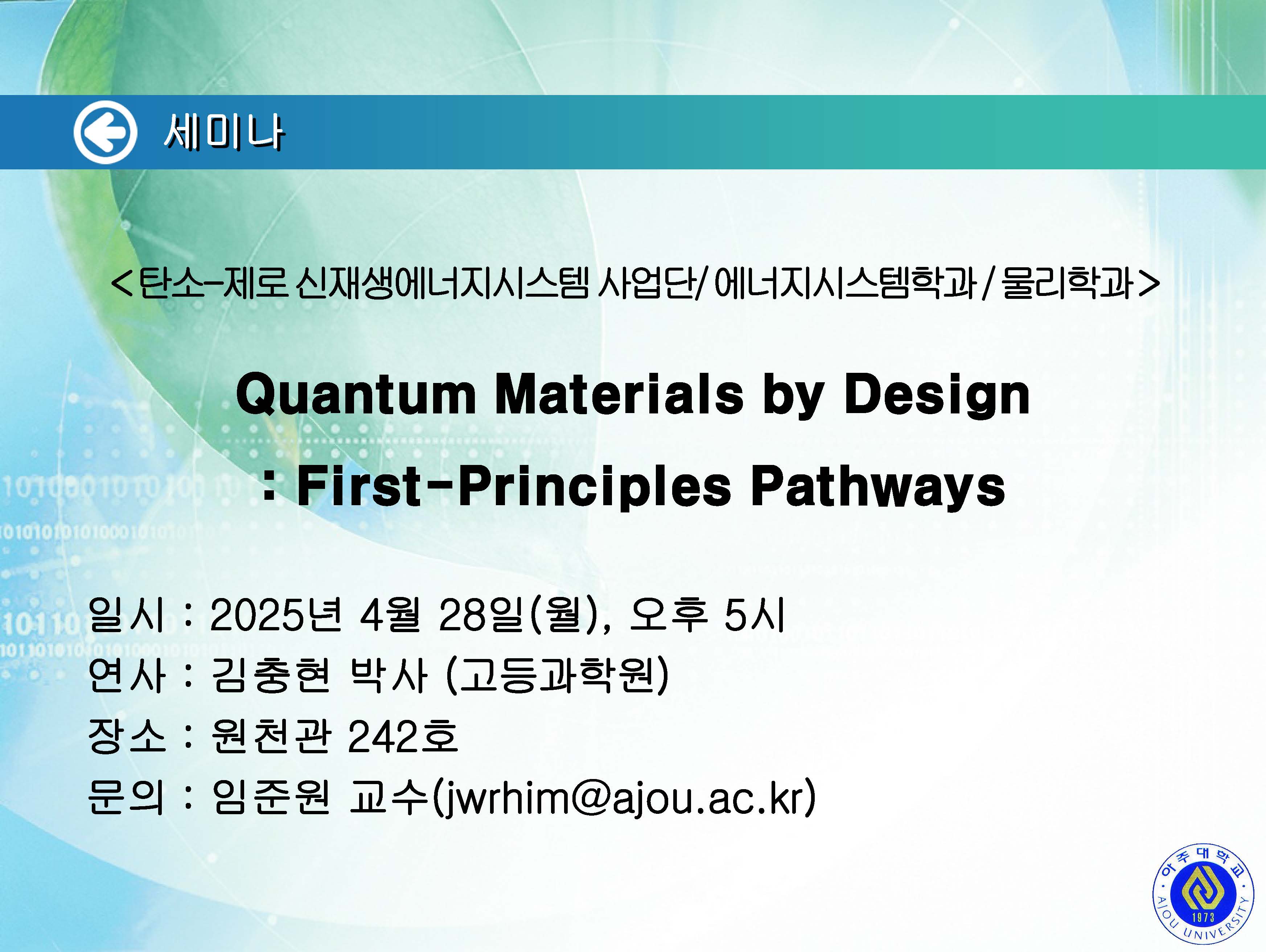 [2025.5.7.(수)] < 화학과 / G-램프(LAMP)사업단 / 탄소-제로 신재생에너지시스템사업단 / 기초과학연구소 > 세미나 안내
