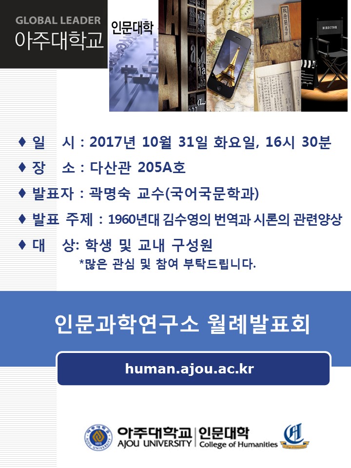 | 567 | 세미나/포럼 | 교내 | 이정아 | 2017-10-30 | ||