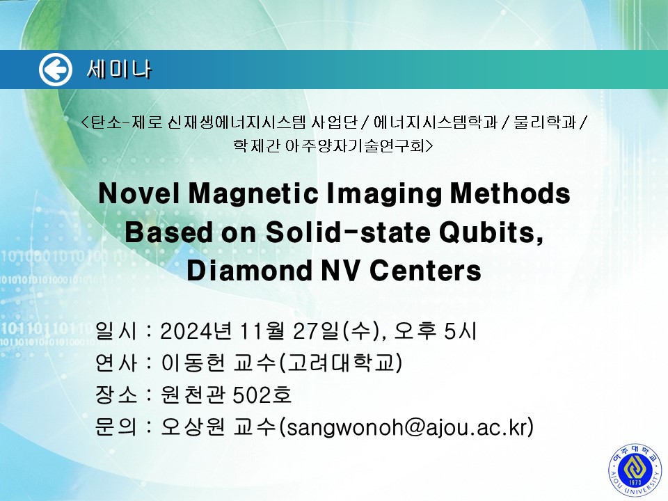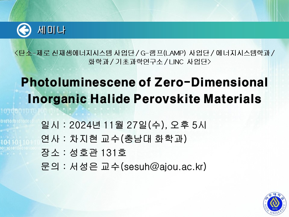 [2024.11.27.수] <탄소-제로 신재생에너지시스템 사업단/G-램프(LAMP) 사업단/에너지시스템학과/화학과/기초과학연구소/LINC 사업단> 세미나 안내