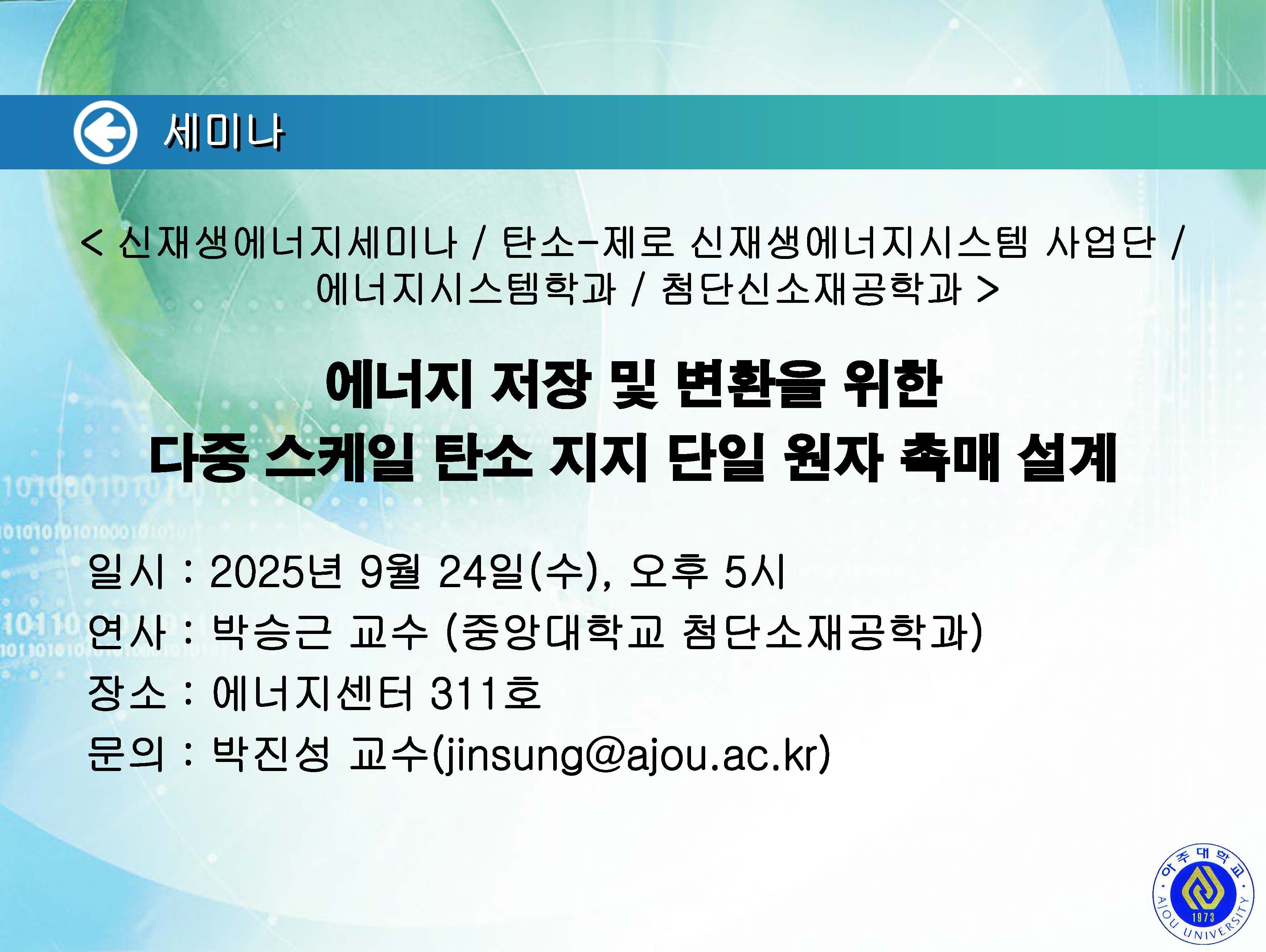 [2025.09.24.수] <신재생에너지세미나 / 탄소-제로 신재생에너지시스템 사업단 / 에너지시스템학과 / 첨단신소재공학과> 세미나 안내